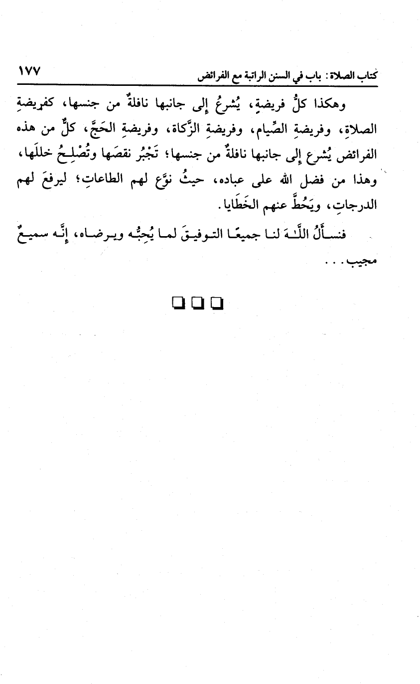 وهكذا كل فريضة يشرع إلى جانبها نافلة من جنسها؛ كفريضة الصلاة وفريضة الصيام، وفريضة الزكاة، وفريضة الحج، كل من هذه الفرائض يشرع إلى جانبها نافلة من جنسها؛ تجبر نقصها وتصلح خللها، وهذا من فضل الله على عباده، حيث نوع لهم الطاعات ليرفع لهم الدرجات، ويحط عنهم الخطايا.