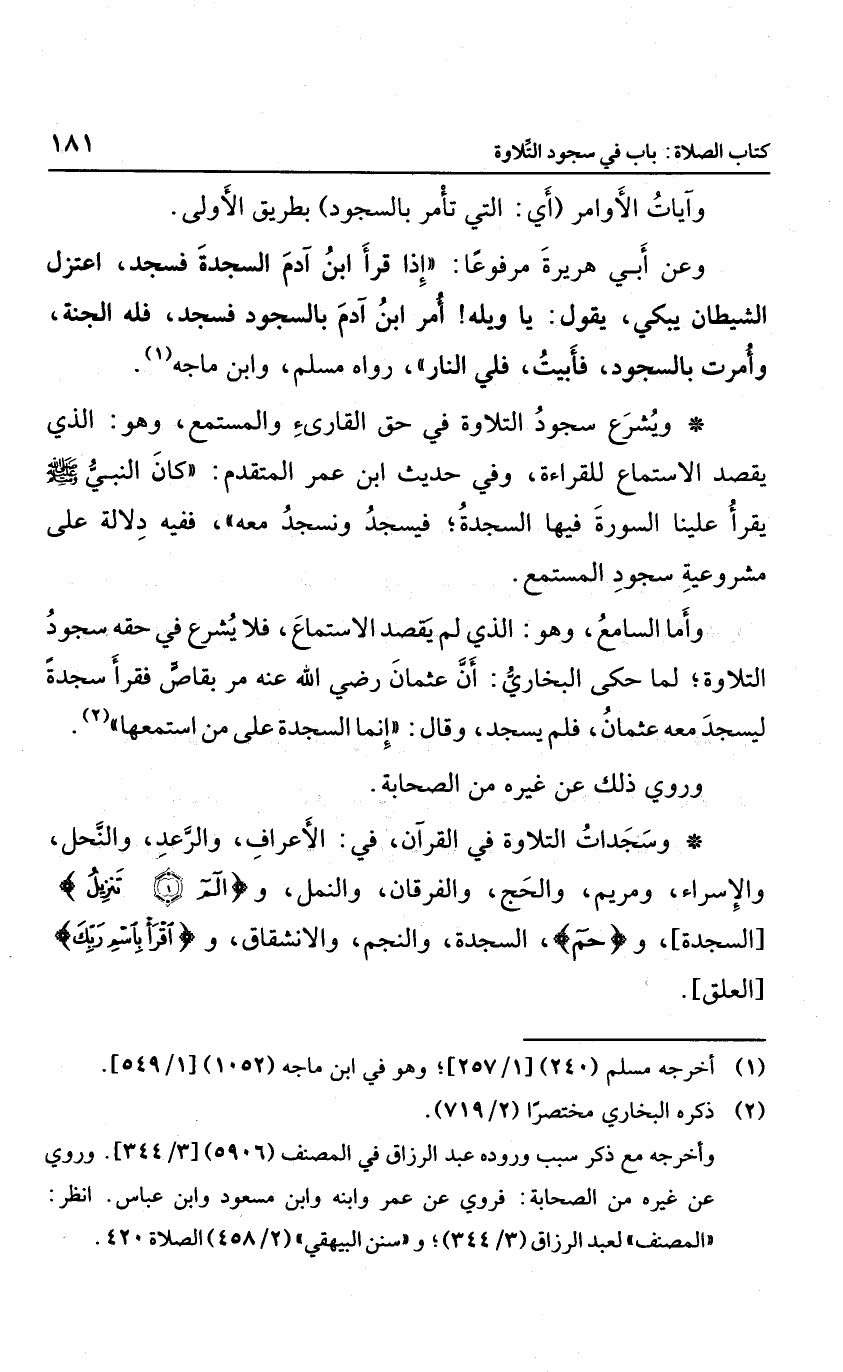 وسجدات التلاوة والقرآن؛ في: الأعراف، والرعد، والنحل، والإسراء، وحريم، والحج، والفرقان، والنمل، وألم تنزل، وحم السجدة، والنجم، والانشقاق، واقرأ باسم ربك،