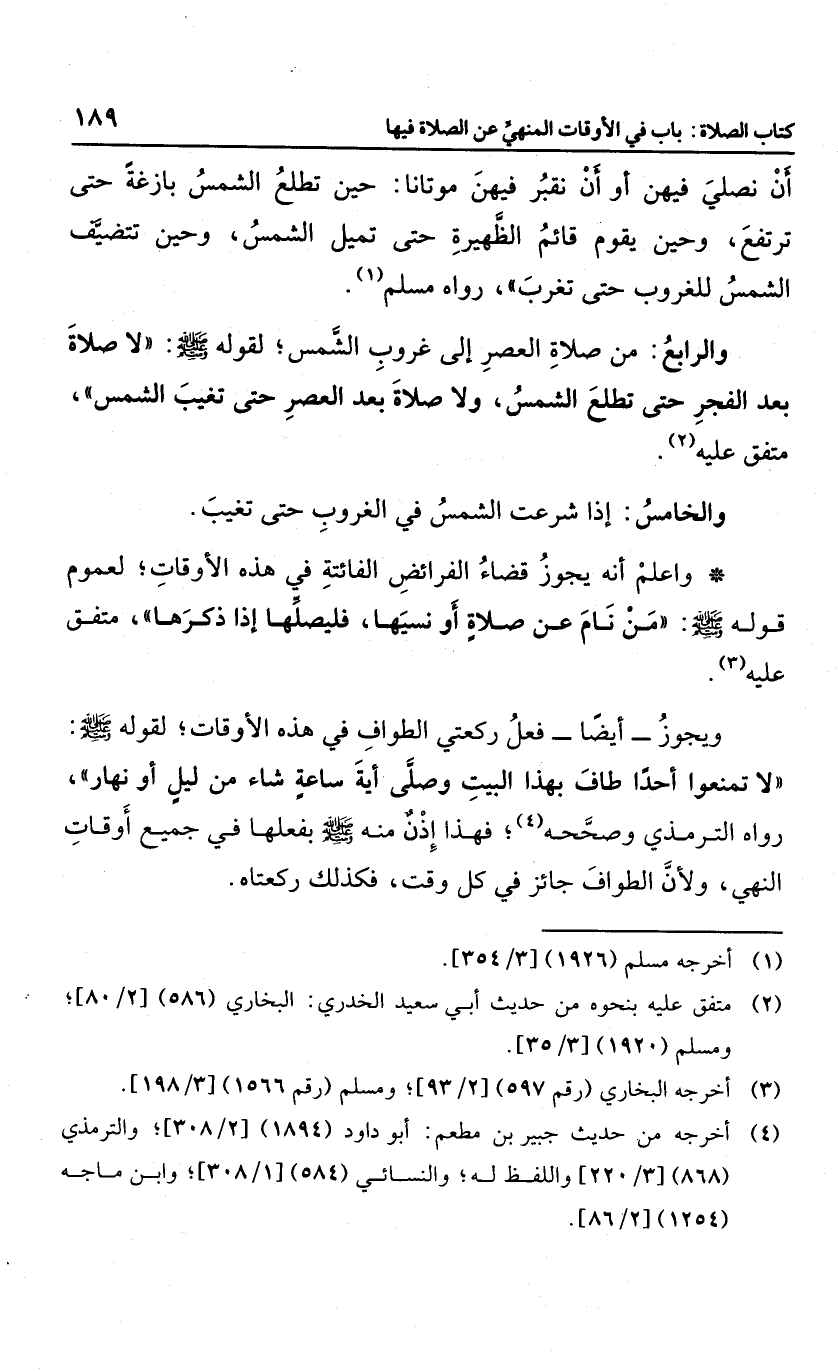 ويجوز أيضا فعل ركعتي الطواف في هذه الأوقات؛ لقوله: "لا تمنعوا أحداً طاف بهذا البيت وصلى أية ساعة من ليل أو نهار"، رواه الترمذي وصححه؛ فهذا إذن منه بفعلها في جميع أوقات النهي، ولأن الطواف جائز في كل وقت؛ فكذلك ركعتاه.