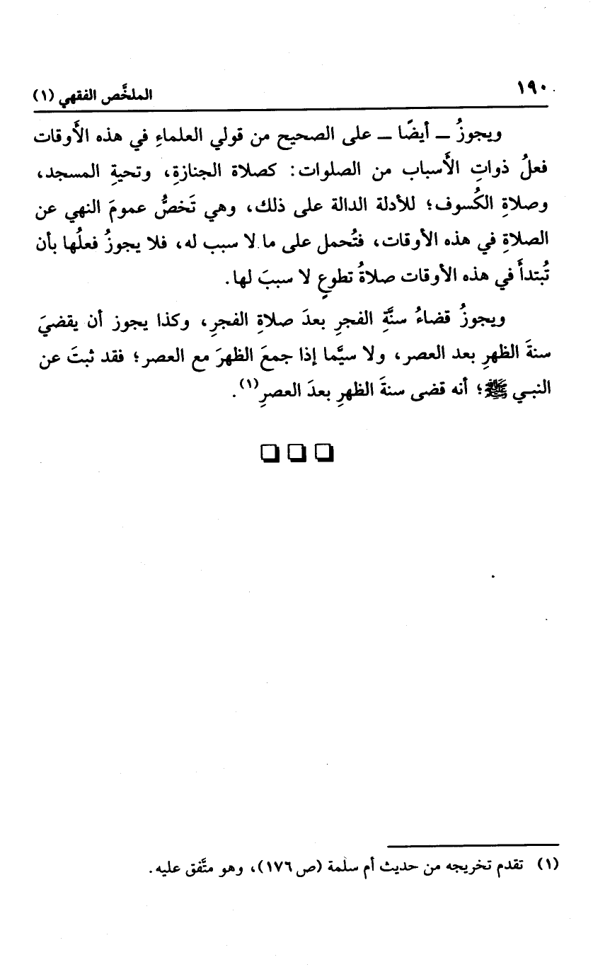 ويجوز أيضا على الصحيح من قولي العلماء في هذه الأوقات فعل ذوات الأسباب من الصلوات؛ كصلاة الجنازة، وتحية المسجد، وصلاة الكسوف؛ للأدلة الدالة على ذلك، وهي تخص عموم النهي عن الصلاة في هذه الأوقات، فتحمل على ما لا سبب له؛ فلا يجوز فعلما بأن تبتدأ في هذه الأوقات صلاة تطوع لا سبب لها.