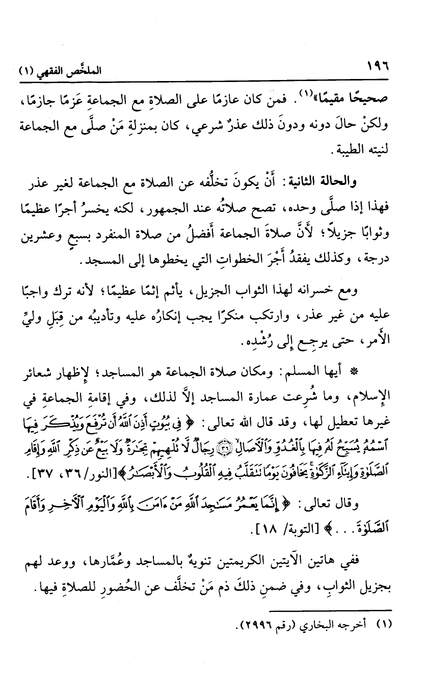 ففي هاتين الآيتين الكريمتين تنويه بالمساجد وعمارها، ووعد له بجزيل الثواب، وفي ضمن ذلك ذم من تخلف عن الحضور للصلاة فيها.
