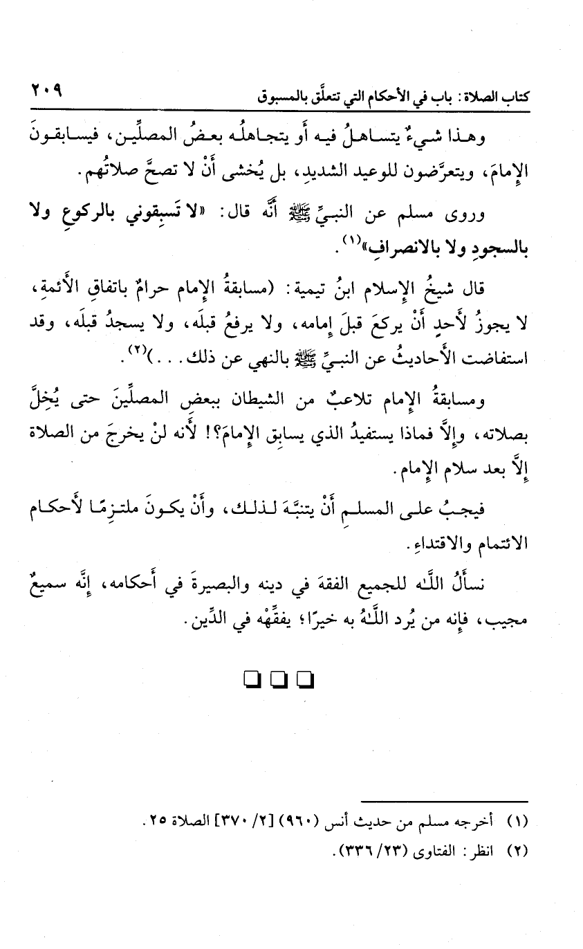 وهذا شيء يتساهل فيه أو يتجاهله بعض المصلين، فيسابقون الإمام، ويتعرضون للوعيد الشديد، بل يخشى أن لا تصح صلاتهم،