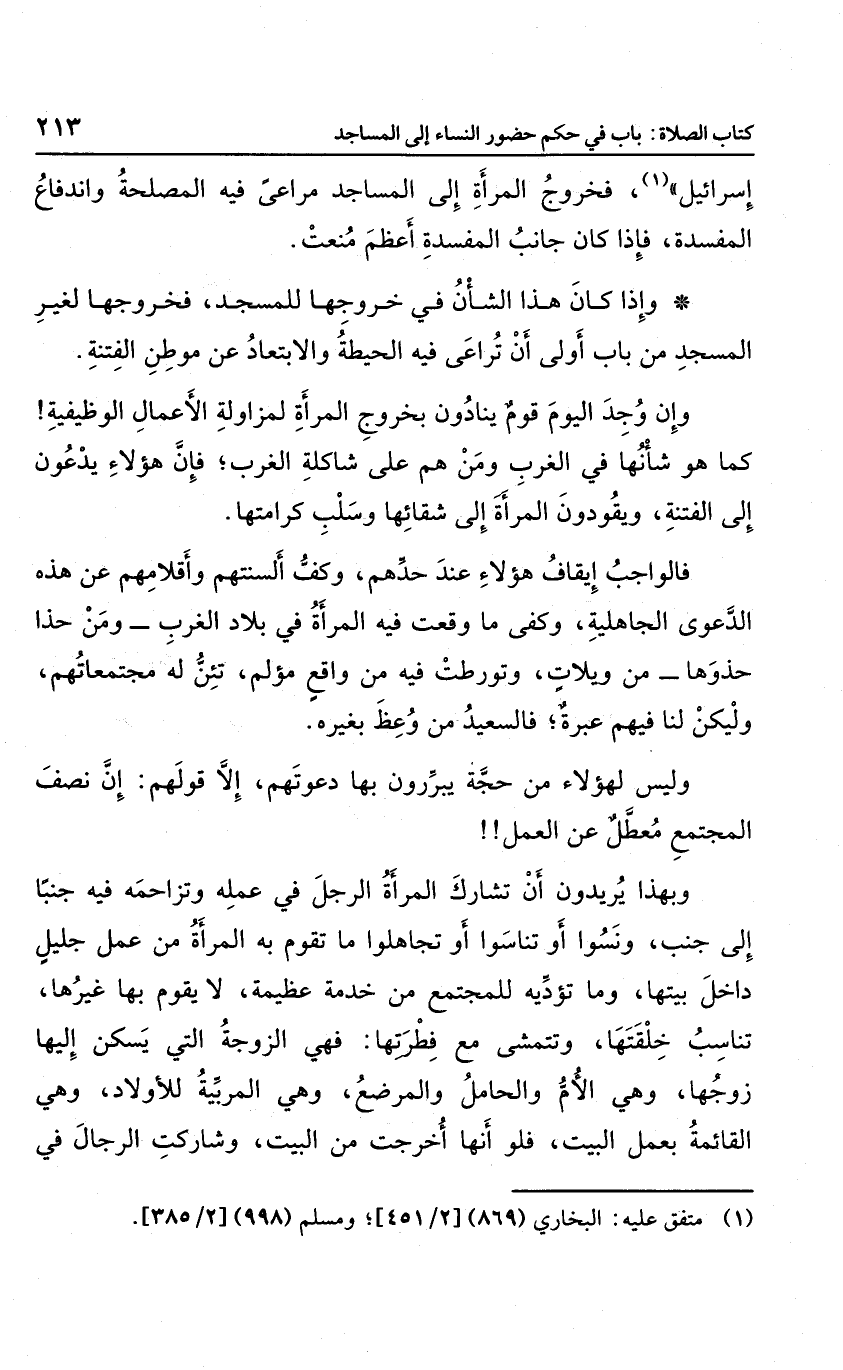 إسرائيل"؛ فخروج المرأة إلى المساجد مراعى فيه المصلحة واندفاع المفسدة، فإذا كان جانب المفسدة أعظم؛ منعت
