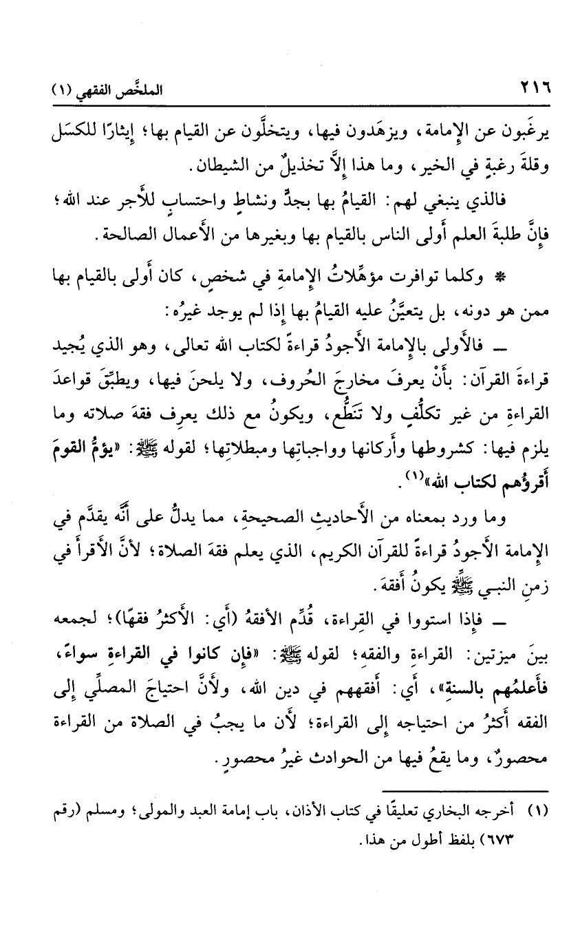 فإذا استووا في القراءة؛ قدم الأفقه "أي: الأكثر فقها "؛ لجمعه بين ميزتين: القراءة والفقه؛ لقوله صلى الله عليه وسلم: "فإن كانوا في القراءة سواء؛ فأعلمهم بالسنة"؛ أي: أفقههم في دين الله، ولأن احتياج المصلي إلى الفقه أكثر من احتياجه إلى القراءة؛ لأن ما يجب في الصلاة من القراءة محصور، وما يقع فيها من الحوادث غير محصور.