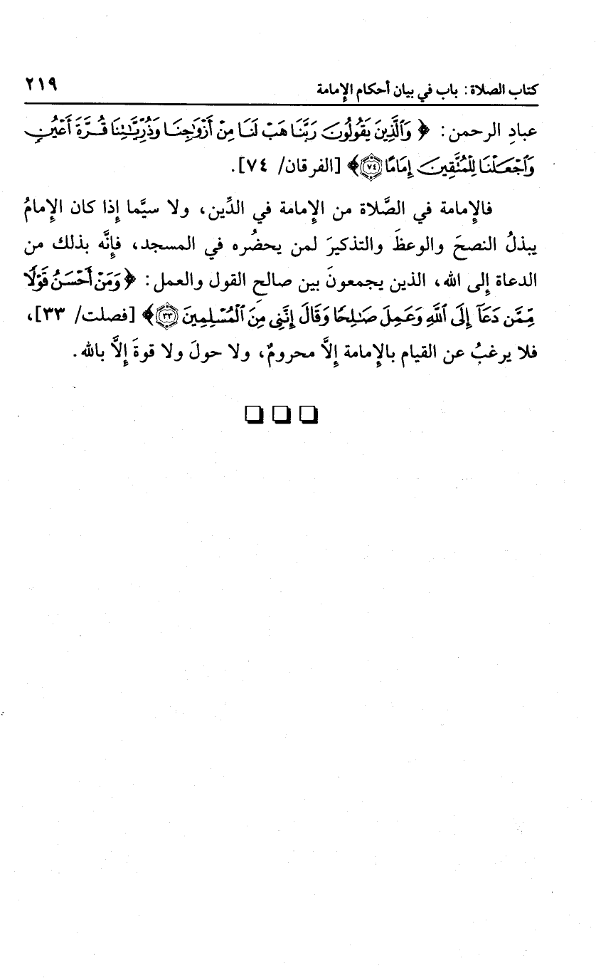 فالإمامة في الصلاة من الإمامة في الدين، ولا سيما إذا كان الإمام يبذل النصح والوعظ والتذكير لمن يحضره في المسجد، فإنه بذلك من الدعاة إلى الله، الذين يجمعون بين صالح القول والعمل، {وَمَنْ أَحْسَنُ قَوْلاً مِمَّنْ دَعَا إِلَى اللَّهِ وَعَمِلَ صَالِحاً وَقَالَ إِنَّنِي مِنَ الْمُسْلِمِينَ} ؛ فلا يرغب عن القيام بالإمامة إلا محروم، ولا حول ولا قوة إلا بالله.