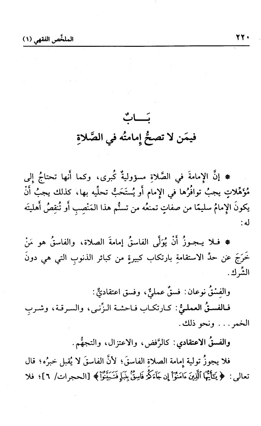 فلا يجوز أن يولي الفاسق إمامة الصلاة، والفاسق هو من خرج عند حد الاستقامة بارتكاب كبيرة من كبائر الذنوب التي هي دون الشرك.