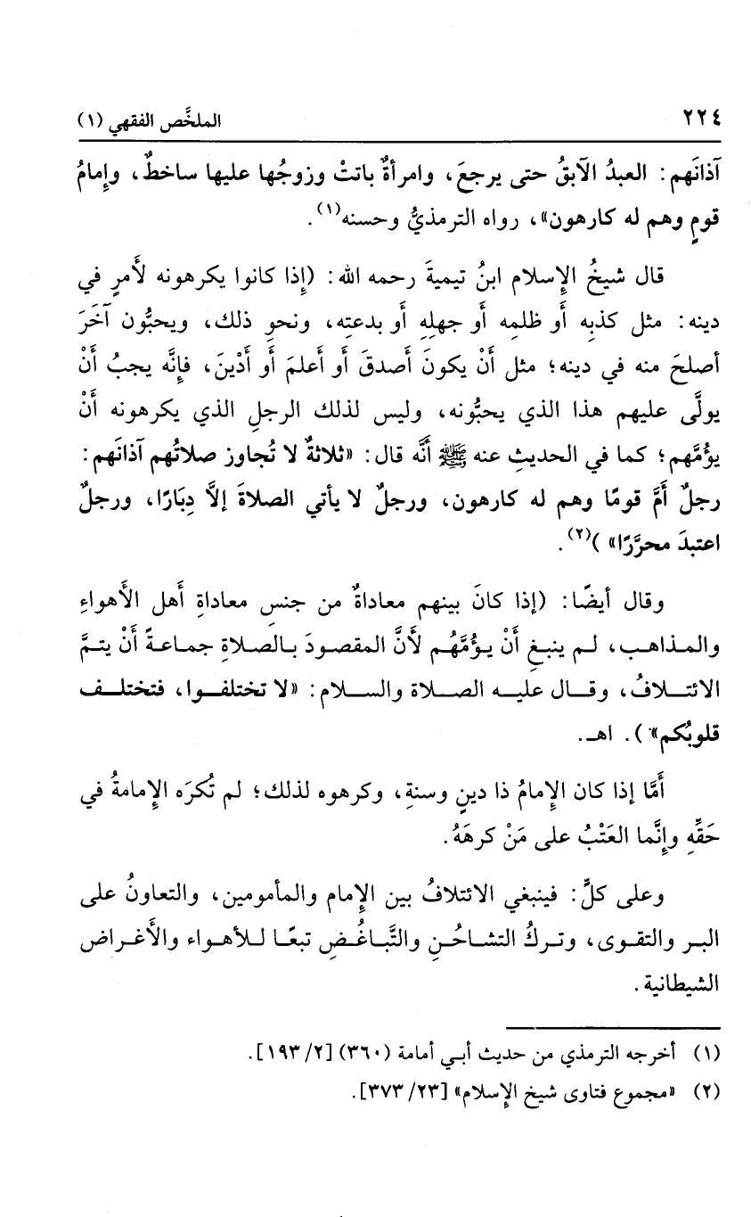 قال شيخ الإسلام ابن تيمية رحمه الله: "إذا كانوا يكرهونه لأمر في دينه؛ مثل كذبة أو ظلمه أو جهله أو بدعته ونحو ذلك، ويحبون آخر أصلح منه في دينه؛ مثل أن يكون أصدق أو أعلم أو أدين؛ فإنه يجب أن يولى عليهم هذا الذي يحبونه، وليس لذلك الرجل الذي يكرهونه أن يؤمهم؛ كما في الحديث عنه صلى الله عليه وسلم؛ أنه قال: "ثلاثة لا تجاوز صلاتهم آذانهم ك رجل أم قوما وهم له كارهون، ورجل لا يأتي الصلاة إلا دبارًا، ورجل اعتبد محررًا" "