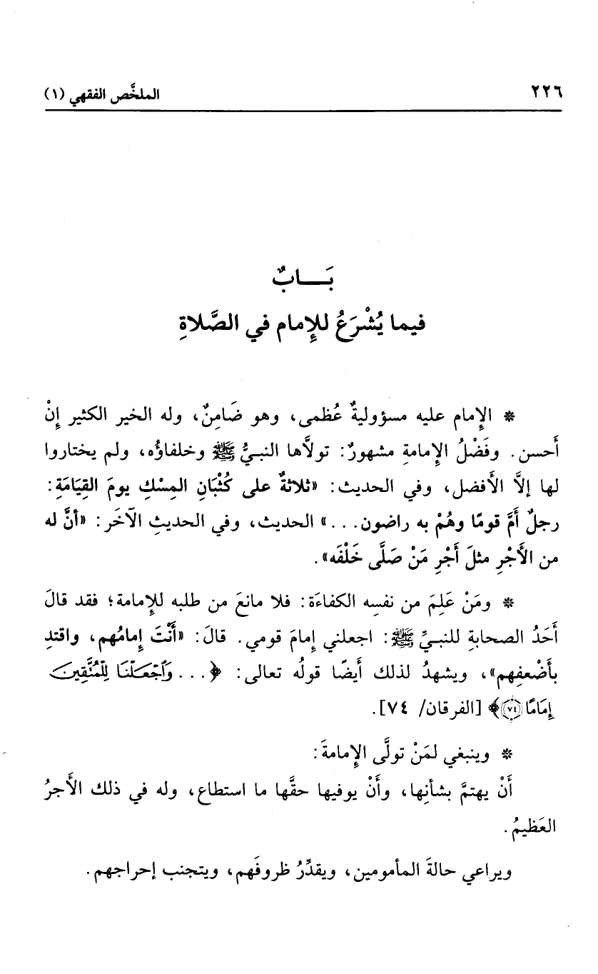 الإمام عليه مسئولية عظيمة، وهو ضامن، وله الخير الكثير إن أحسن وفضل الإمامه مشهور، تولاها النبي صلى الله عليه وسلم وخلفاؤه، ولم يختاروا لها إلا الأفضل وفي الحديث: "ثلاثة على كثبان المسك يوم القيامة: رجل أم قوما وهم به راضون...." الحديث، وفي الحديث الآخر أن له من الأجر مثل أجر من صلى خلفه.