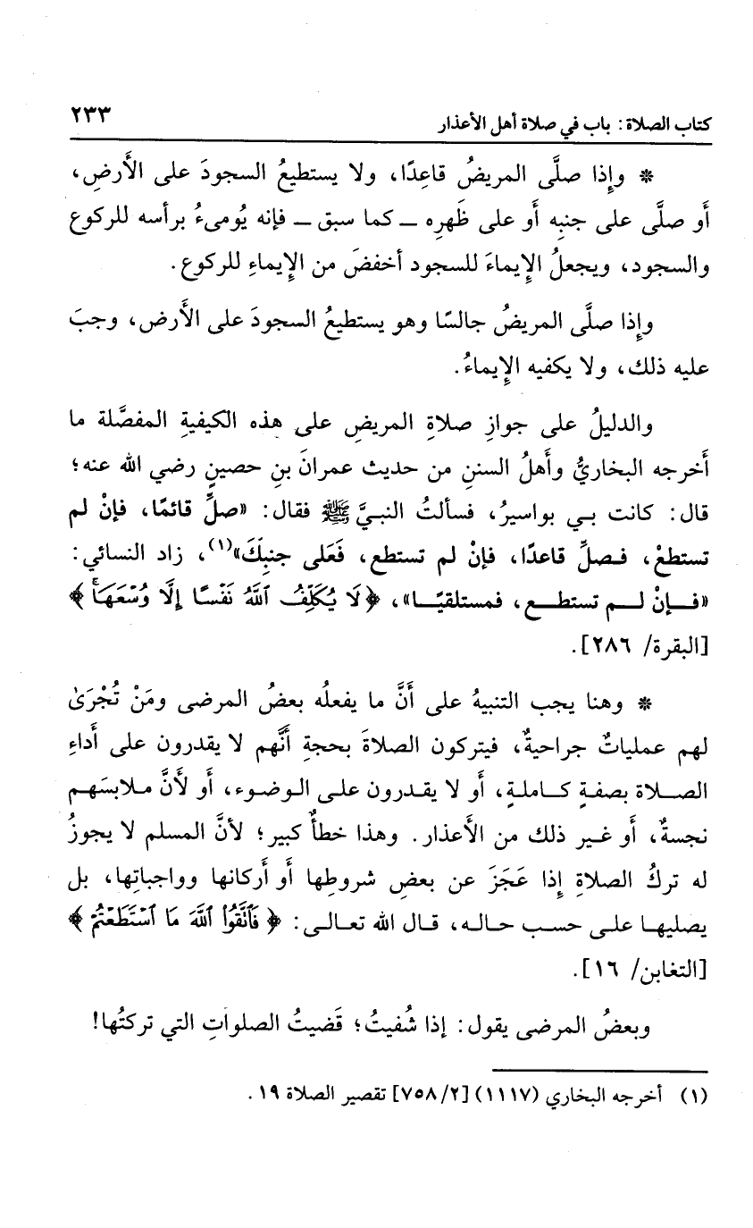 والدليل على جواز صلاة المريض على هذه الكيفية المفصلة ما أخرجه البخاري وأهل السنن من حديث عمرن بن حصين رضي الله عنه؛ قال: كانت بي بواسير، فسألت النبي صلى الله عليه وسلم؟ فقال: "صل قائما، فإن لم تستطع؛ فصل قاعدًا، فإن لم تستطع، فعلى جنبك"، زاد النسائي: "فإن لم تستطع؛ فمستلقيا، {لا يُكَلِّفُ اللَّهُ نَفْساً إِلَّا وُسْعَهَا} ".