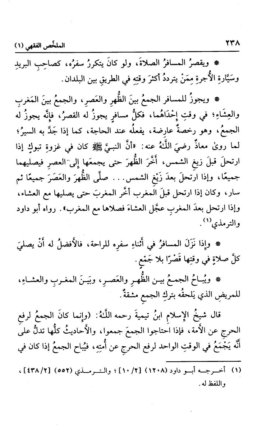 ويجوز للمسافر الجمع بين الظهر والعصر، والجمع بين المغرب والعشاء؛ في وقت أحدهما؛ فكل مسافر يجوز له القصر؛ فإنه يجوز له الجمع، وهو رخصة عارضة، يفعله عند الحاجة، كما إذا جد به السير؛ لما روى معاذ رضي الله عنه؛: "أن النبي صلى الله عليه وسلم كان في عزوة تبوك: إذا ارتحل قبل زيغ الشمس؛ أخر الظهر حتى يجمعها إلى العصر ويصليهما جمعا، وإذا ارتحل بعد زيغ الشمس؛ صلى الظهر والعصر جمعا ثم سار، وكان يفعل مثل ذلك في المغرب والعشاء"، رواه أبو داود والترمذي.
