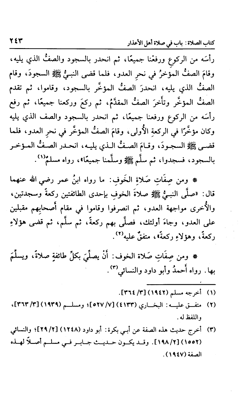"قام النبي صلى الله عليه وسلم صلاة الخوف بإحدى الطائفتين ركعة وسجدتين والأخرى مواجهة العدوى، ثم انصرفوا وقاموا مقام أصحابهم مقبلين على العدو، وجاء أولئك فصلى بهم ركعة، ثم سلم، ثم قضى هؤلاء ركعة، وهؤلاء ركعة"، متفق عليه.