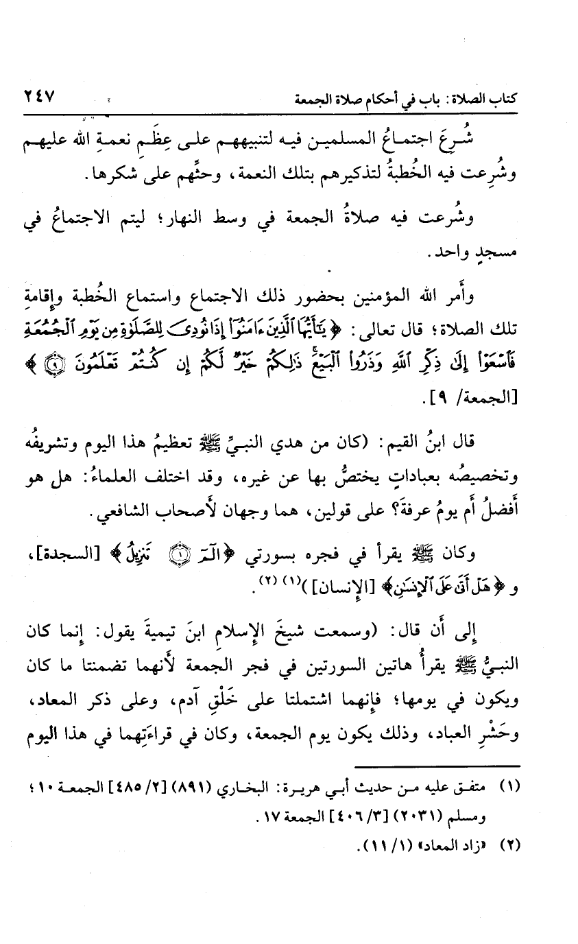 إلى أن قال: "وسمعت شيخ الإسلام ابن تيمية يقول: إنما كان النبي صلى الله عليه وسلم يقرأ هاتين السورتين في فجر الجمعة لأنهما تضمنتها ما كان في يومها؛ فإنهما اشتملتا على خلق آدم، وعلى ذكر المعاد، وحشر العباد، وذلك يكون يوم الجمعة، وكان في قراءتهما في هذا اليوم