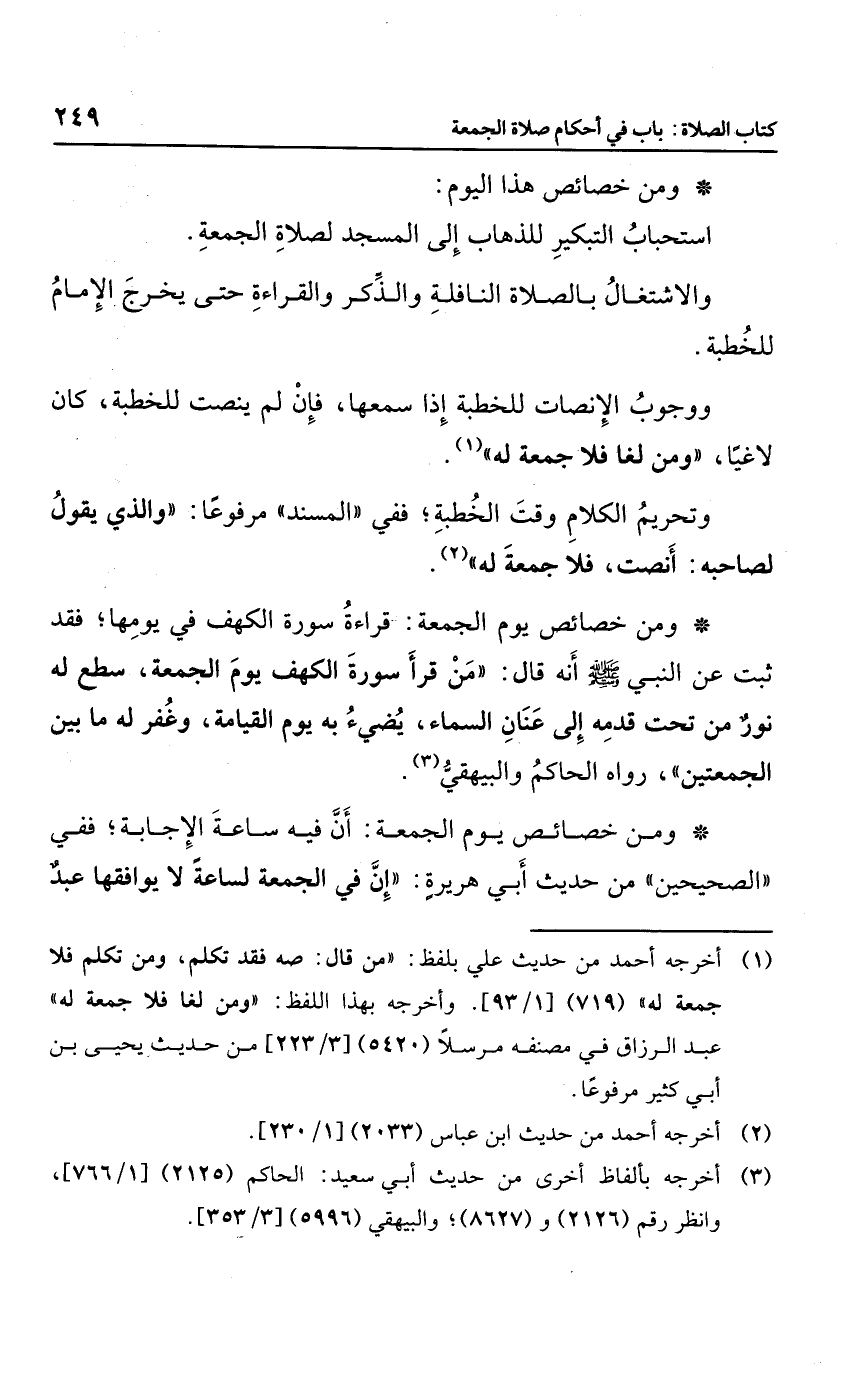 استحباب التكبير للذهاب إلى المسجد لصلاة الجمعة، والاشتغال بالصلاة النافلة والذكر والقراءة حتى يخرج الإمام للخطبة، ووجوب الإنصات للخطبة إذا سمعها فإن لم ينصت للخطبة؛ كان لاغيا، ومن لغا؛ فلا جمعة له، وتحريم الكلام وقت الخطبة؛ ففي "المسند" مرفوعا: "والذي يقول لصاحبه: أنصت؛ فلا جمعة له".