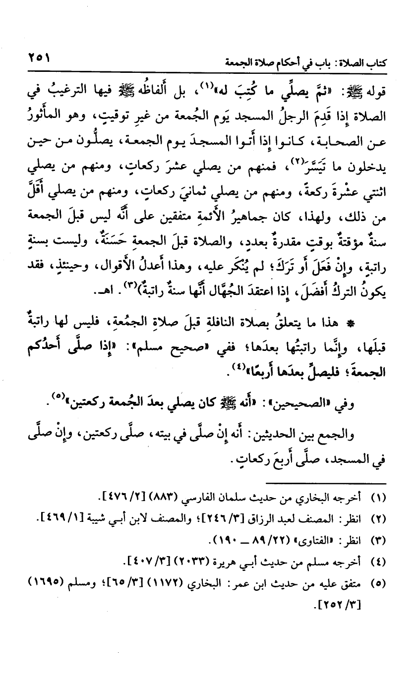 قوله صلى الله عليه وسلم: "ثم يصلي ماكتب له"، بل ألفاظه صلى الله عليه وسلم فيها الترغيب في الصلاة إذا قدم الرجل المسجد يوم الجمعة من غير توقيت، وهو المأثور عن الصحابة، كانوا إذا أتوا المسجد يوم الجمعة؛ يصلون من حين يدخلون ما تيسر؛ فمنهم من يصلي عشر ركعات، ومنهم من يصلي اثنتي عشرة ركعة، ونهم من يصلي ثماني ركعات، ومنهم من يصلي أقل من ذلك، ولهذا؛ كان جماهير الأئمة متفقين على أنه ليس قبل الجمعة سنة مؤقتة بوقت مقدرة بعدد، والصلاة قبل الجمعة الأقوال، وحينئذ؛ فقد يكون الترك أفضل أو ترك؛ لم ينكر عليه، وهذا أعدل الأقوال، وحينئذ؛ فقد يكون الترك أفضل، إذا اعتقد الجهال أنها سنة راتبة" اه.