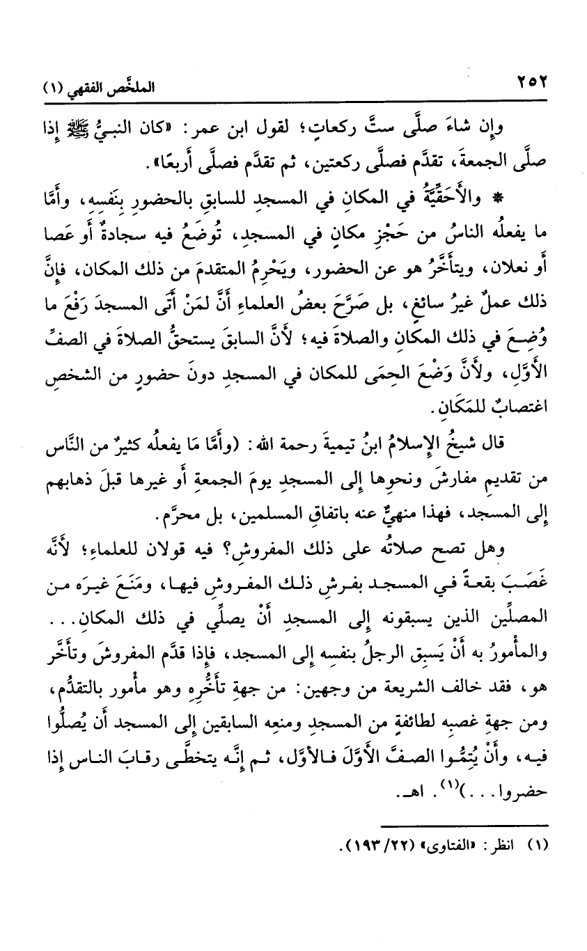 قال شيخ الإسلام ابن تيمية رحمه الله: "وأما ما يفعله كثير من الناس من تقدم مفارش ونحوها إلى المسجد يوم الجمعة قبل صلاتهم؛ فهذا منهي عنه باتفاق المسلمين، بل محرم،