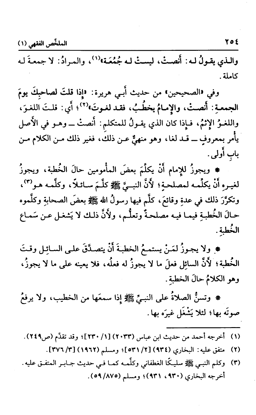 وفي "الصحيحين" من حديث أبي هريرة: "إذا قلت لصاحبك يوم الجمعة أنصت والإمام يخطب؛ فقد لغوت"؛ أي: قلت اللغو، واللغو الإثم، فإذا كان الذي يقول للمتكلم: أنصت وهو في الأصل يأمر بمعروف، قد لغا، وهو منهي عن ذلك؛ فغير ذلك من الكلام من باب أولى.