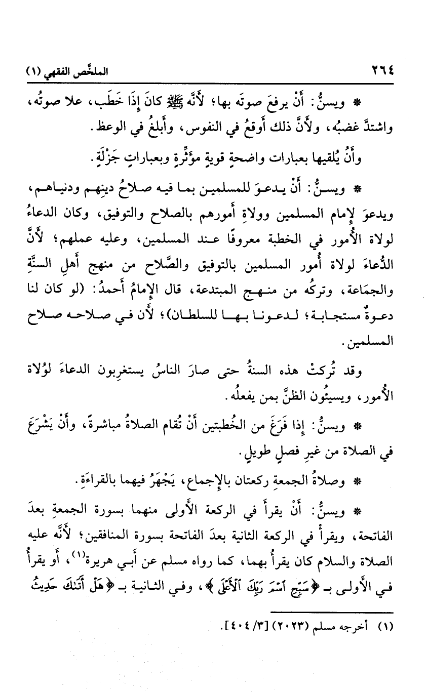 ويسن أن يدعو للمسلمين بما فيه صلاح دينهم ودنياهم، ويدعو لإمام المسلمين وولاة أمورهم بالصلاح والتوفيق، وكان الدعاء لولاة الأمور في الخطبة معروفا عند المسلمين، وعليه عملهم؛ لأن الدعاء لولاة أمور المسلمين بالتوفيق والصلاح من منهج أهل السنة والجماعة، وتركه من منهج المبتدعة، قال الإمام أحمد: "لو كان لنا دعوة مستجابة؛ لدعونا بها للسلطان"، ولأن في صلاحه صلاح المسلمين.