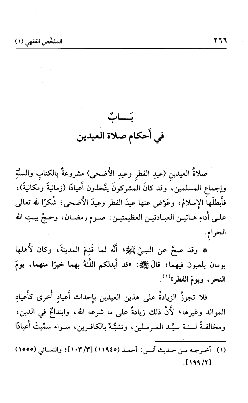 صلاة العيدين عيد الفطر وعيد الأضحى مشروعة بالكتاب والسنة وإجماع المسلمين، وقد كان المشركون يتخذون أعيادًا زمانية ومكانية، فأبطلها الإسلام، وعوض عنها عيد الفطر وعيد الأضحى، شكرًا لله تعالى على أداء هاتين العبادتين العظيمتين: صوم رمضان، وحج بيت الله الحرام.
