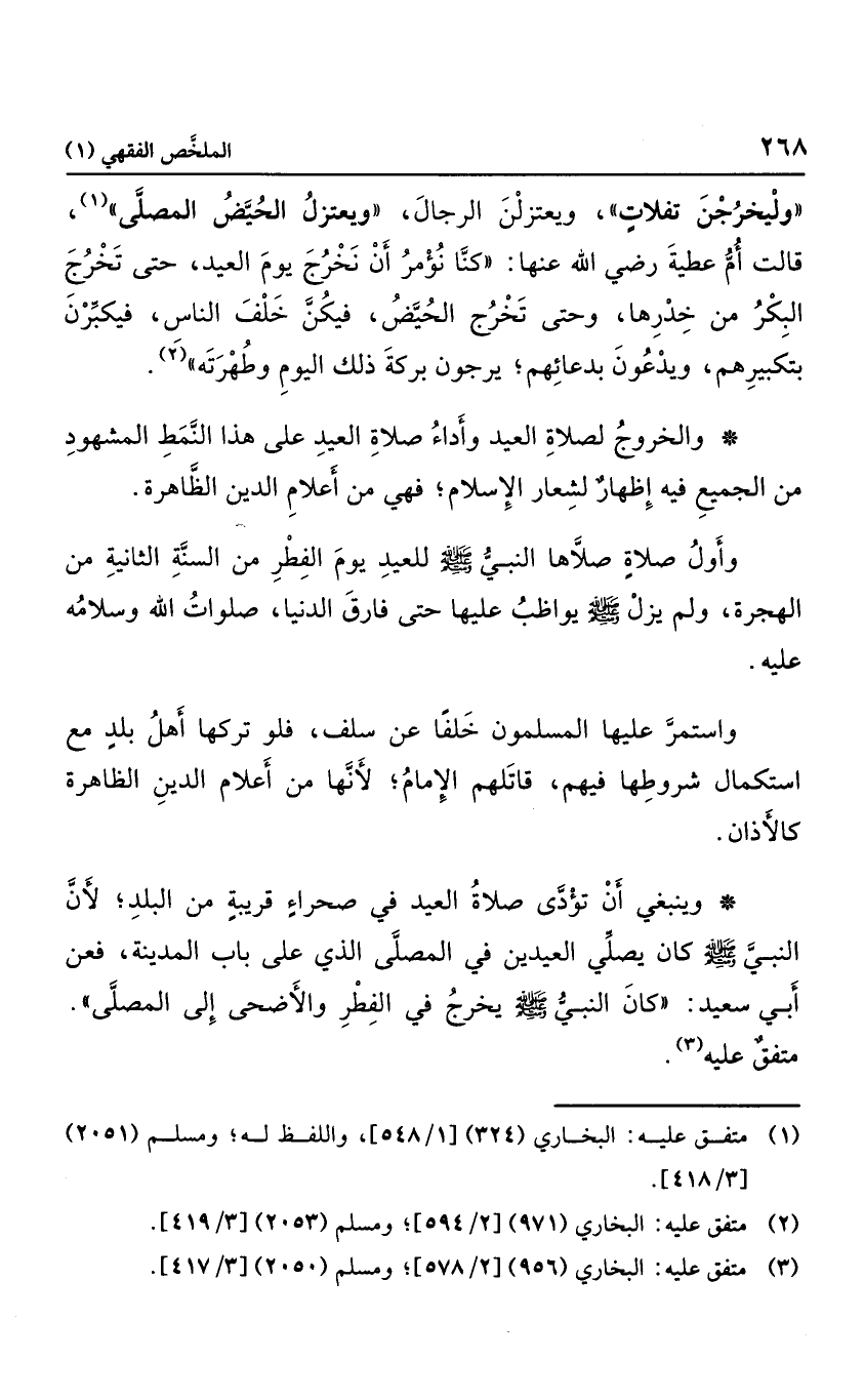 "وليخرجن تفلات، ويعتزلن الرجال، ويعتزل الحيض المصلى"، قالت أم عطية رضي الله عنها: "كنا نؤمر أن نخرج يوم العيد، حتى تخرج البكر من خدرها، وحتى تخرج الحيض، فيكن خلف الناس، فيكبرن بتكبيرهم، ويدعون بدعائهم؛ يرجون بركة ذلك اليوم وطهرته".