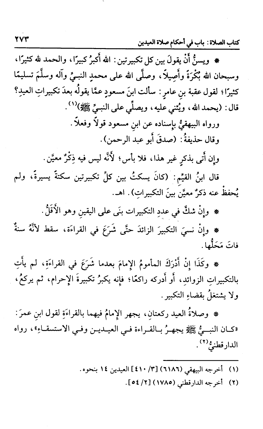 وصلاة العيد ركعتان، يجهر الإمام فيهما بالقراءة؛ لقول ابن عمر: "كان النبي صلى الله عليه وسلم يجهر بالقراءة في العيدين والاستسقاء"، رواه الدارقطني،
