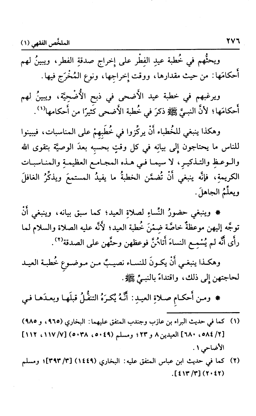 ويحثهم في خطبة عيد الفطر على إخراج صدقة الفطر، ويبين لهم أحكامها؛ من حيث مقدارها، ووقت إخراجها، ونوع المخرج فيها. ويرغبهم في خطبة عيد الأضحى في ذبح الأضحية، ويبين لهم أحكامها؛ لأن النبي صلى الله عليه وسلم ذكر في خطبة الأضحى كثيرًا من أحكامها.