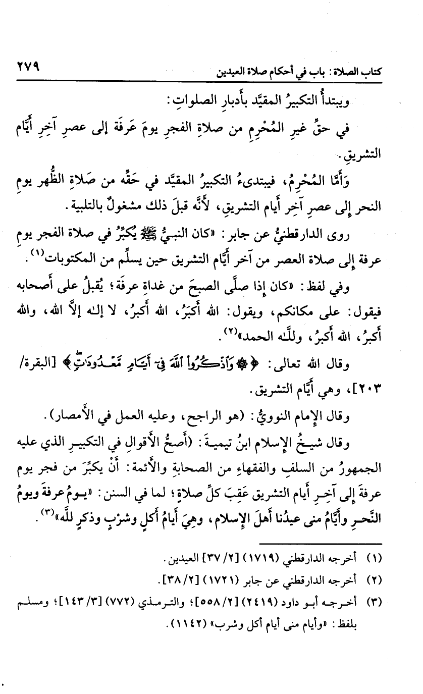 وقال شيخ الإسلام ابن تيمية: "أصح الأقوال في التكبير الذي عليه الجمهور من السلف والفقهاء من الصحابة والأئمة: أن يكبر من فجر يوم عرفة إلى آخر أيام التشريق عقب كل صلاة؛ لما في "السنن": "يوم عرفة ويوم النحر وأيام منى عيدنا أهل الإسلام، وهي أيام أكل وشرب وذكر لله"،