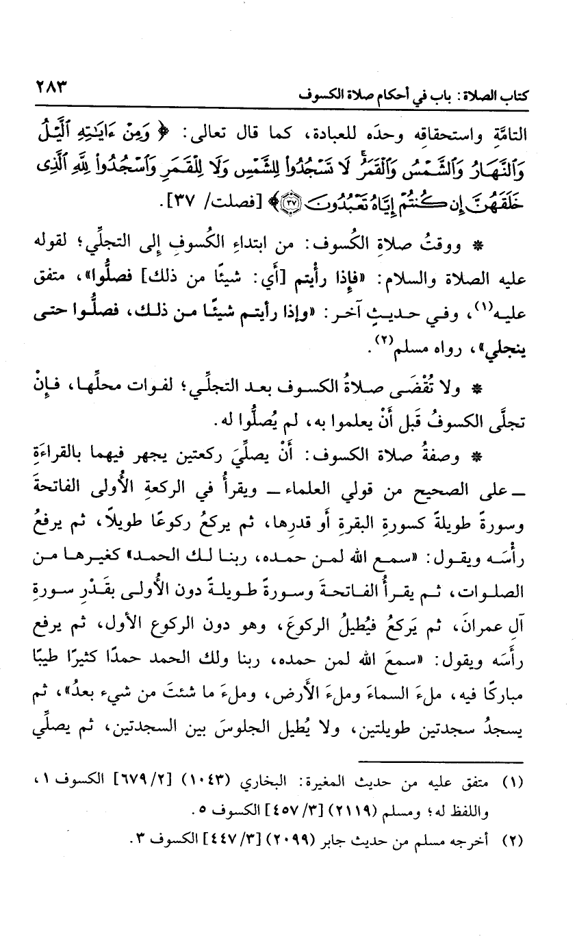 ووقت صلاة الكسوف: من ابتداء الكسوف إلى التجلي؛ لقوله صلى الله عليه وسلم: "فإذا رأيتم ذلك؛ فصلوا" متفق عليه، وفي حديث آخر: "وإذا رأيتم شيئا من ذلك فصلوا حتى ينجلي"، رواه مسلم.