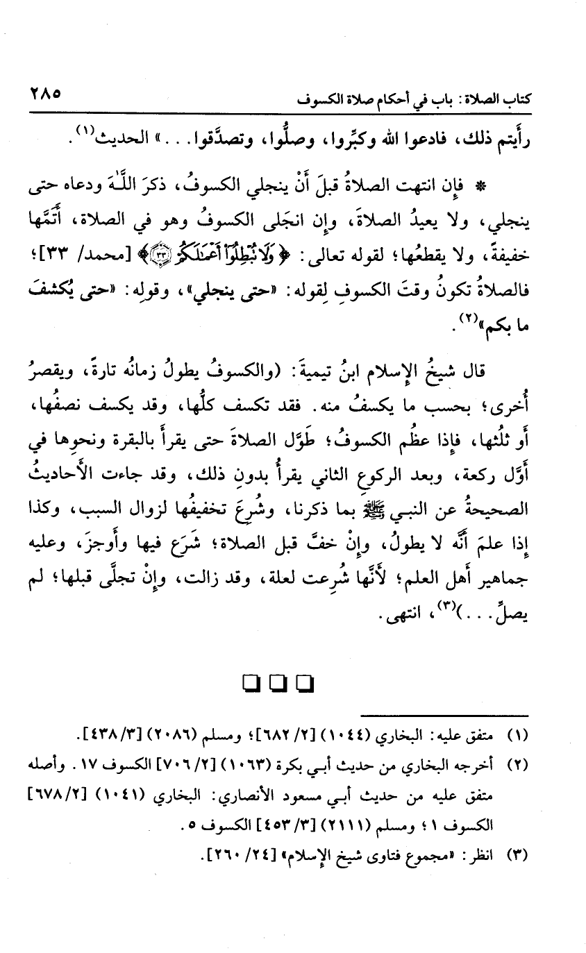 فإن انتهت الصلاة قبل أن ينجلي الكسوف؛ ذكر الله ودعاه حتى ينجلي، ولا يعيد الصلاة، وإن انجلى الكسوف وهو في الصلاة؛ أتمها خفيفة، ولا يقطعها؛ لقوله {وَلا تُبْطِلُوا أَعْمَالَكُمْ} ؛ فالصلاة تكون وقت الكسوف؛ لقوله: "حتى ينجلي"، وقوله: "حتى ينكشف ما بكم".