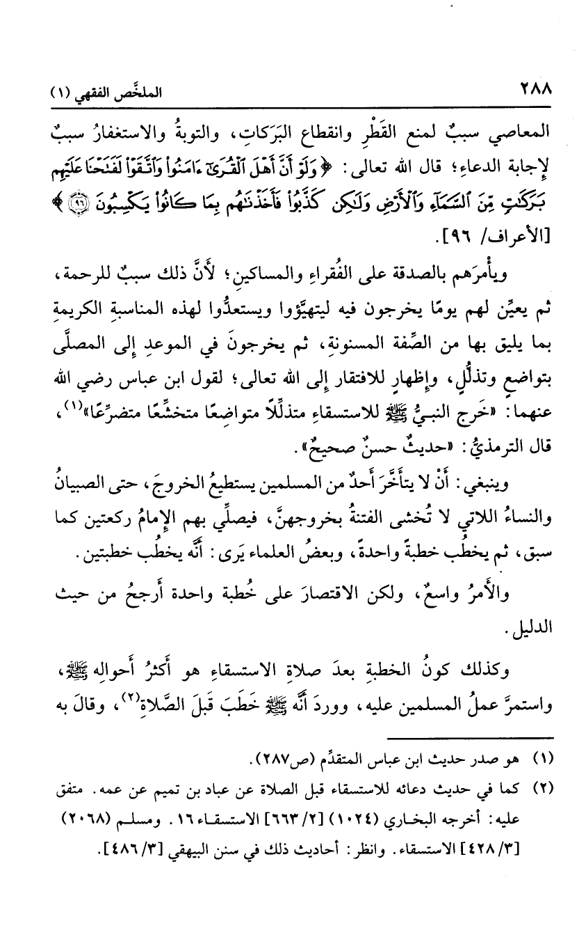 المعاصي سبب لمنع القطر وانقطاع البركات، والتوبة والاستغفار سبب لإجابة الدعاء، قال الله تعالى: {وَلَوْ أَنَّ أَهْلَ الْقُرَى آمَنُوا وَاتَّقَوْا لَفَتَحْنَا عَلَيْهِمْ بَرَكَاتٍ مِنَ السَّمَاءِ وَالأَرْضِ وَلَكِنْ كَذَّبُوا فَأَخَذْنَاهُمْ بِمَا كَانُوا يَكْسِبُونَ} ، ويأمرهم بالصدقة على الفقراء والمساكين، لأن ذلك سبب للرحمة، ثم يعين لهم يوما يخرجون فيه ليتهيؤوا ويستعدوا لهذه المناسبة الكريمة بما يليق بها من الصفة المسنونة، ثم يخرجون في الموعد إلى المصلى بتواضع وتذلل وإظهار للافتقار إلى الله تعالى، ولقول ابن عباس رضي الله عنهما: "خرج النبي صلى الله عليه وسلم للاستسقاء متذللاً متواضعا متخشعا متضرعا"، قال الترمذي: "حديث حسن صحيح".