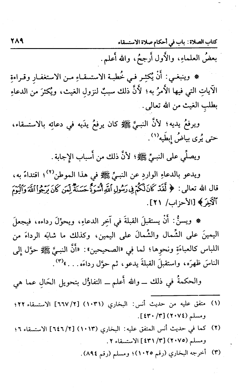 ويسن أن يستقبل القبلة في آخر الدعاء، ويحول رداءه؛ فيجعل اليمين على الشمال والشمال على اليمين، وكذلك ما شابه الرداء من اللباس كالعباءة ونحوها؛ لما في "الصحيحين"؛ "أن النبي صلى الله عليه وسلم حول الناس إلى ظهره، واستقبل القبلة يدعو، ثم حول رداءه ... ".