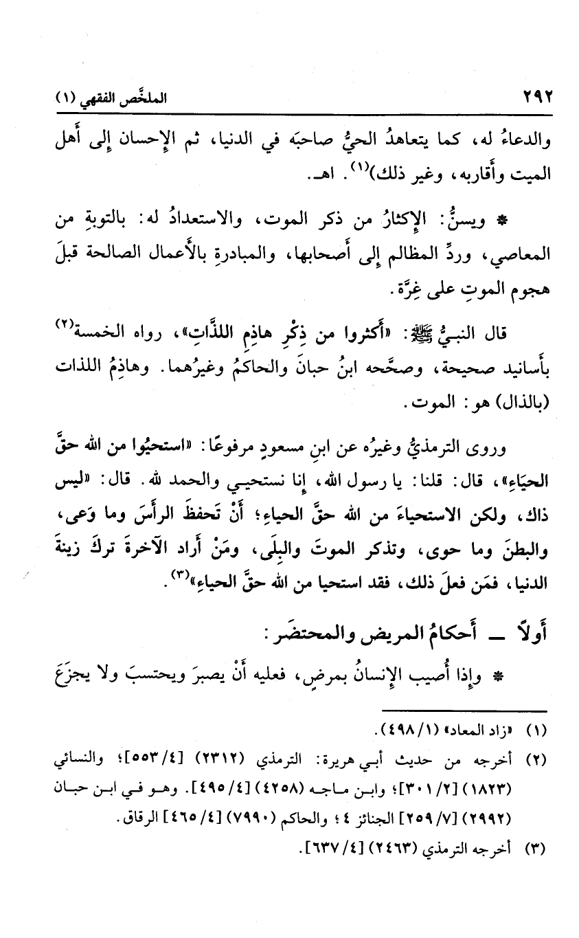ويسن الإكثار من ذكر الموت والاستعداد له بالتوبة من المعاصي، ورد المظالم إلى أصحابها، والمبادرة بالأعمال الصالحة قبل هجوم الموت على غرة.