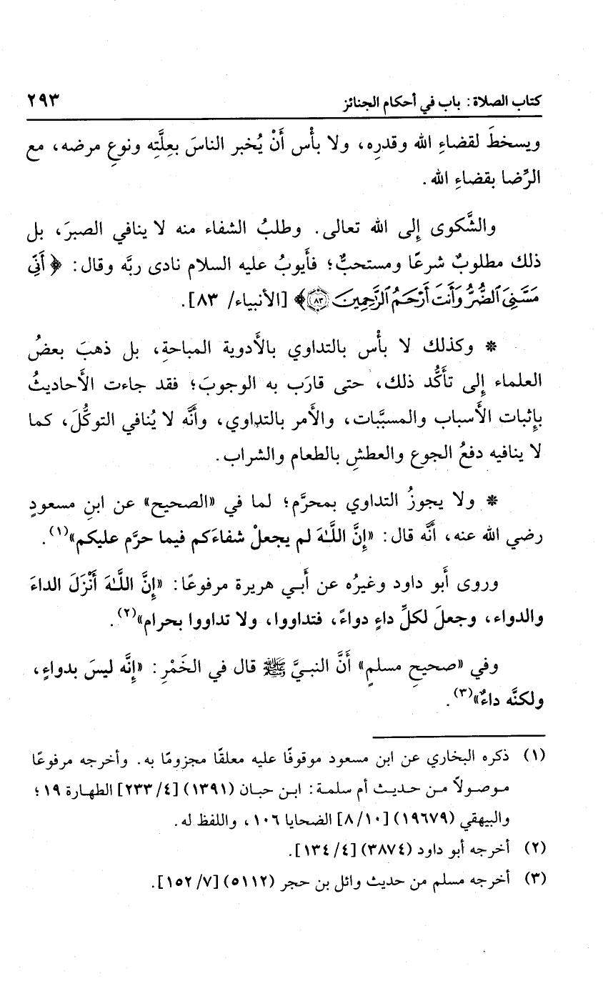 ولا يجوز التداوي بمحرم؛ لما في "الصحيح" عن ابن مسعود رضي الله عنه؛ أنه قال: "أن الله لم يجعل شفاءكم فيما حرم عليكم"، وروى أبو داود وغيره عن أبي هريرة مرفوعا: "إن الله أنزل الدواء، وأنزل الداء، وجعل لكل داء دواء، ولا تداووا بحرام"، وفي "صحيح مسلم"؛ أن النبي صلى الله عليه وسلم قال في الخمر: "إنه ليس بدواء ولكنه داء".