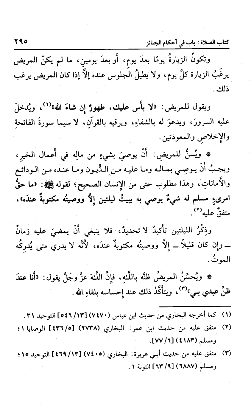 ويسن للمريض أن يوصي بشيء من ماله في أعمال الخير، ويجب أن يوصي بماله وما عليه من الديون وما عنده من الودائع والأمانات، وهذا مطلوب، حتى من الإنسان الصحيح؛ لقوله صلى الله عليه وسلم: "ما حق امرئ مسلم له شيء يوصي به يبيت ليلتين إلا ووصيته مكتوبة عنده"، متفق عليه، وذكر الليلتين تأكيد لا تحديد؛ فلا ينبغي أن يمضي عليه زمان، وإن كان قليلاً، إلا ووصيته مكتوبة عنده؛ لأنه لا يدري متى يدركه الموت.