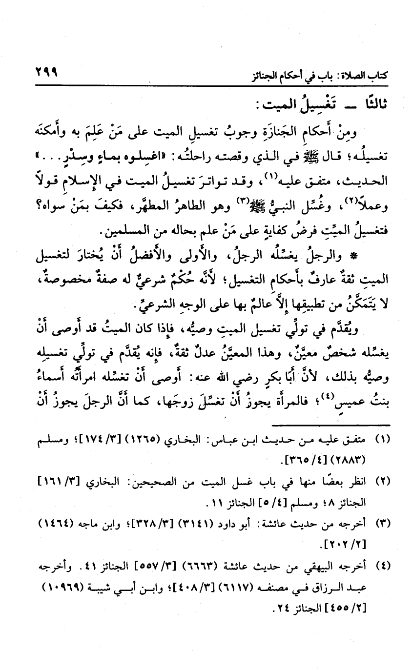 ومن أحكام الجنازة وجوب تغسيل الميت على من علم به وأمكنه تغسيله، قال صلى الله عليه وسلم في الذي وقصته راحلته: "اغسلوه بماء وسدر ... " الحديث متفق عليه، وقد تواتر تغسيل الميت في الإسلام قولاً وعملاً، وغسل النبي صلى الله عليه وسلم وهو الطاهر المطهر؛ فكيف بمن سواه؟ فتغسيل الميت فرض كفاية على من علم بحاله من المسلمين.