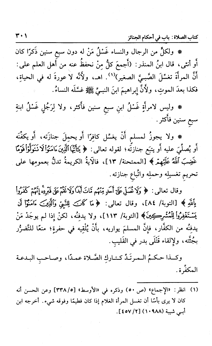 ولا يجوز لمسلم أن يغسل كافرًا أو يحمل جنازته أو يكفنه أو يصلي عليه أو يتبع جنازته؛ لقوله تعالى: {يَا أَيُّهَا الَّذِينَ آمَنُوا لا تَتَوَلَّوْا قَوْماً غَضِبَ اللَّهُ عَلَيْهِم} ؛ فالآية الكريمة تدل بعمومها على تحريم تغسيله وحمله واتباع جنازته، وقال تعالى: {وَلا تُصَلِّ عَلَى أَحَدٍ مِنْهُمْ مَاتَ أَبَداً وَلا تَقُمْ عَلَى قَبْرِهِ إِنَّهُمْ كَفَرُوا بِاللَّهِ} ، وقال تعالى: {مَا كَانَ لِلنَّبِيِّ وَالَّذِينَ آمَنُوا أَنْ يَسْتَغْفِرُوا لِلْمُشْرِكِينَ} ، ولا يدفنه، لكن إذا لم يوجد من يدفنه من الكفار؛ فإن المسلم يواريهن بأن يلقيه في حفرة؛ منعا للتضرر بجثته، ولإلقاء قتلى بدر في القليب، وكذا حكم المرتد كتارك الصلاة عمدًا وصاحب البدعة المكفرة،
