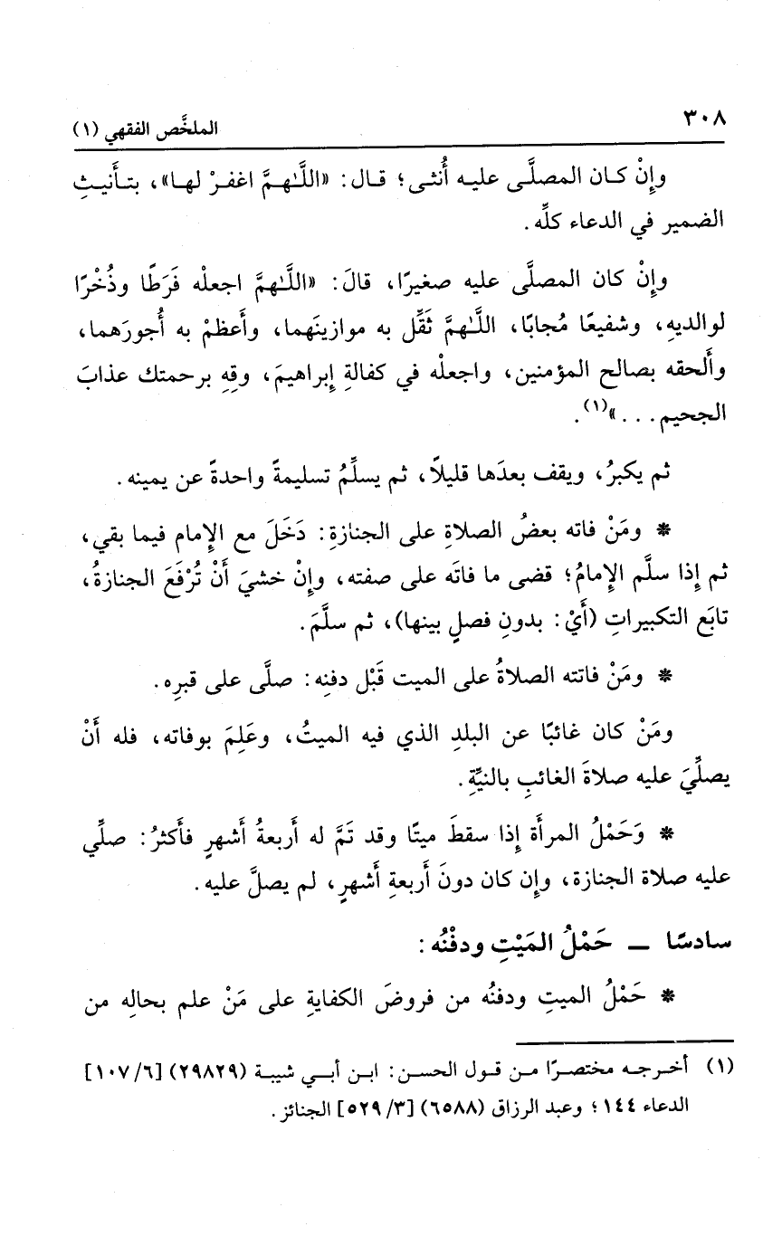وإن كان المصلى عليه أنثى؛ قال: "اللهم اغفر لها"؛ بتأنيث الضمير في الدعاء كله، وإن كان المصلى عليه صغيرًا؛ قال: "اللهم اجعله ذخرًا لوالديه، وفرطا، بصالح سلف المؤمنين، واجعله في كفالة إبراهيم، وقه برحمتك عذاب الجحيم"، ثم يكبر، ريقف بعدها قليلاً، ثم يسلم تسليمة واحدة عن يمينه