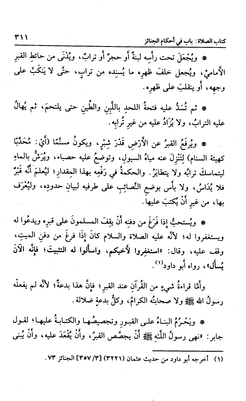 ويرفع القبر عن الأرض قدر سبر، ويكون مسنما أي: محدبا كهيئة السنام لتنزل عنه مياه السيول، ويوضع عليه حصباء، ويرش بالماء ليتماسك ترابه ولا بتطاير، والحكمة في رفعه بهذا المقدار؛ ليعلم أنه قبر فلا يداس، ولا بأس بوضع النصائب على طرفيه لبيات حدوده، وليعرف بها، من غير أن يكتب عليها.