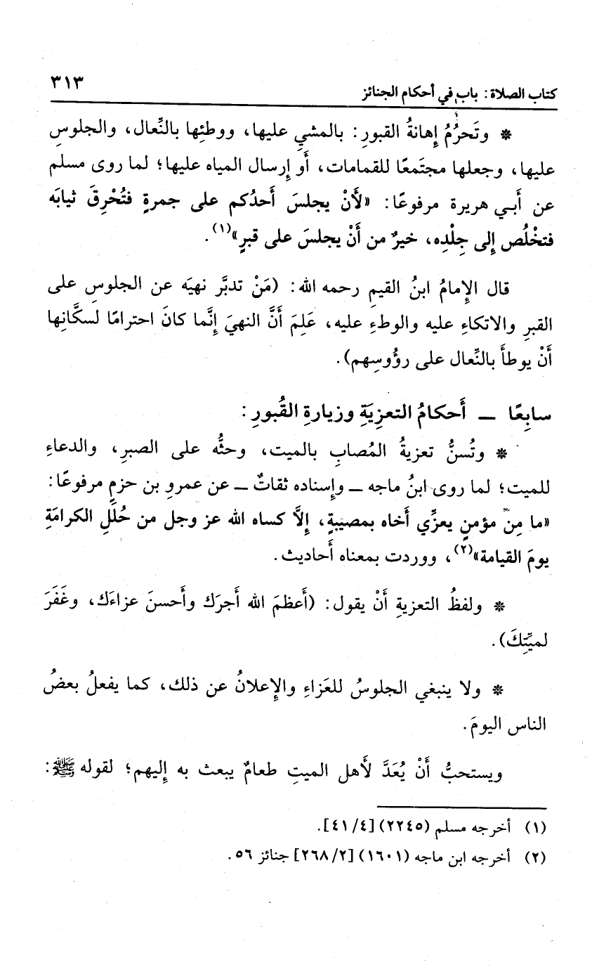 وتحرم إهانة القبور بالمشي عليها ووطئها بالنعال والجلوس عليها وجعلها مجتمعا للقمامات أو أسال المياه عليها؛ لما روى مسلم عن أبي هريرة مرفوعا: "لأن يجلس أحدكم على جمرة، فتخرق ثيابه، فتخلص إلى جلده: خير من أن يجلس على قبر".