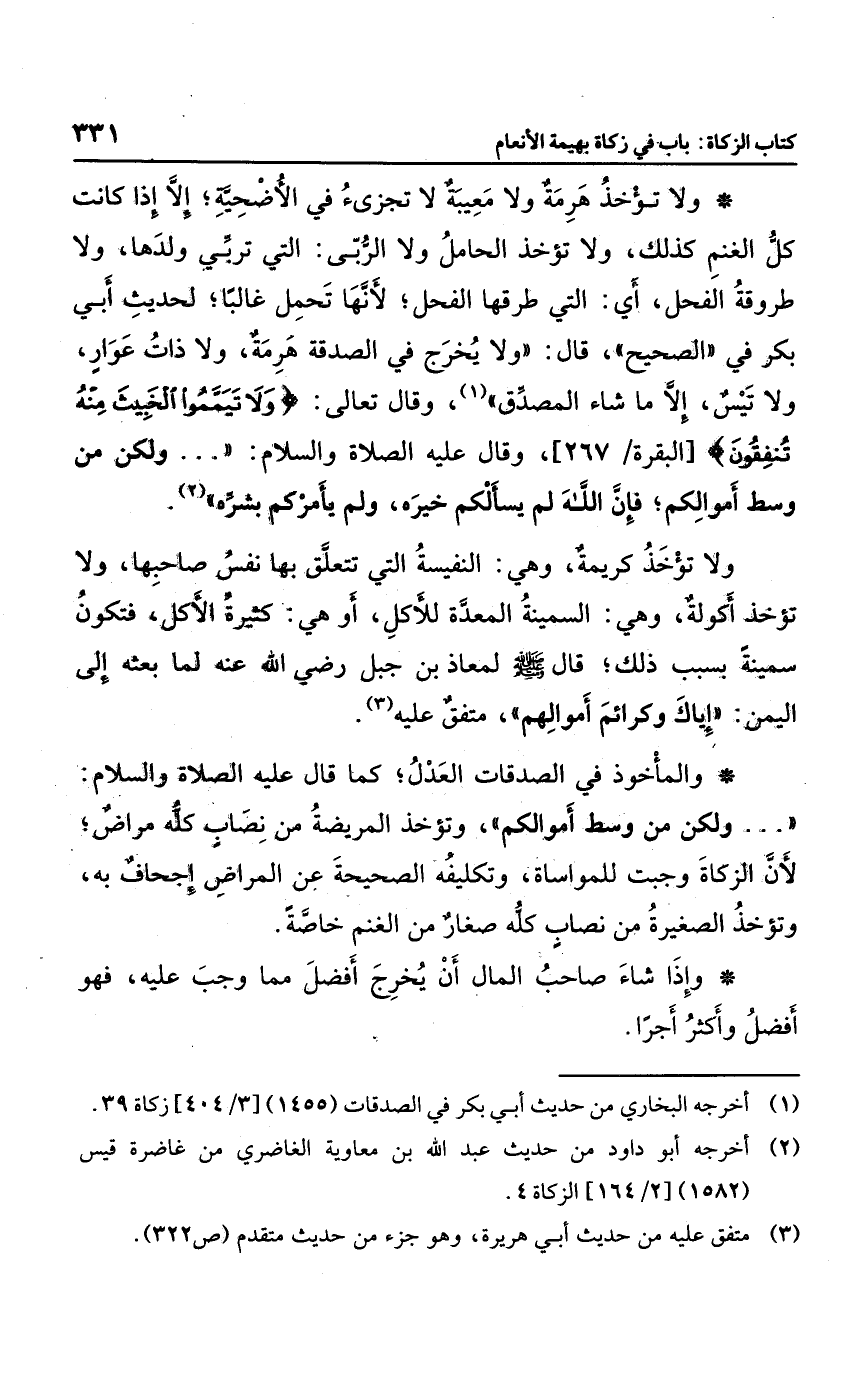 ولا تؤخذ هرمة ولا معيبة لا تجزئ في الأضحية؛ إلا إذا كان كل الغنم كذلك، ولا تؤخذ الحامل ولا الربي التي تربي ولدها ولا طروقة الفحل؛ أي: التي طرقها الفحل؛ لأنها تحمل غالبا؛ لحديث أبي بكر في "الصحيح"؛ قال: "لا يخرج في الصدقة هرمة، ولا ذات عوار، ولا تيس؛ إلا أن يشاء المصدق"، وقال تعالى: {وَلا تَيَمَّمُوا الْخَبِيثَ مِنْهُ تُنْفِقُونَ} ، وقال صلى الله عليه وسلم: "ولكن من أوسط أموالكم؛ فإن الله لم يسألكم خياره، ولم يأمركم بشراره"، ولا تؤخذ كريمة، وهي النفيسة التي تتعلق بها نفس صاحبها، ولا تؤخذ أكولة، وهي السمينة المعدة للأكل، أو هي كثيرة الأكل، فتكون سمينة بسبب ذلك قال صلى الله عليه وسلم لمعاذ بن جبل رضي الله عنه لما بعثه إلى اليمن: "إياك وكرائم أموالهم"، متفق عليه.