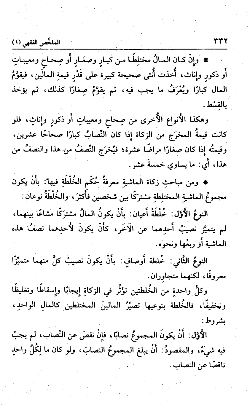 وإن كان المال مختلطا من كبار وصغار أو صحاح ومعيبات أو ذكور وإناث؛ أخذت أنثى صحيحة كبيرة على قدر قيمة المالين، فيقوم المال كبارًا ويعرف ما يجب فيه، ثم يقوم صغارًا كذلك، ثم يؤخذ بالقسط، وهكذا الأنواع الأخرى من صحاح ومعيبات أو ذكور وإناث، فلو كانت قيمة المخرج من الزكاة إذا كان النصاب كبارًا صحاحا عشرين، وقيمته إذا كان صغارًا مراضا عشرة؛ فيخرج النصف من هذا والنصف من هذا؛ أي: ما يساوي خمسة عشر.