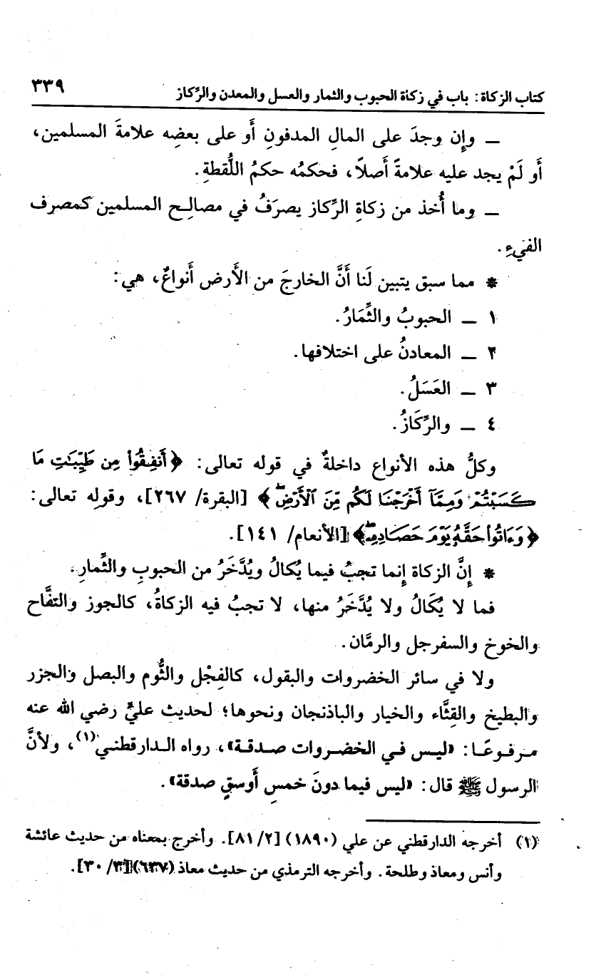 إن الزكاة إنما تجب فيما يكال ويدخر من الحبوب والثمار، فما لا يكال ولا يدخر منها؛ لا تجب فيه الزكاة كالجوز، والتفاح، والخوخ، والسفرجل، والرمان، ولا سائر الخضروات والبقول؛ كالفجل، والثوم، والبصل، والجزر، والبطيخ، والقثاء، والخيار، والباذنجان، ونحوها؛ لحديث على رضي الله عنه مرفوعا: "ليس في الخضروات صدقة"، رواه الدارقطني، ولأن الرسول صلى الله عليه وسلم قال: "ليس فيما دون خمسة أوسق صدقة"،