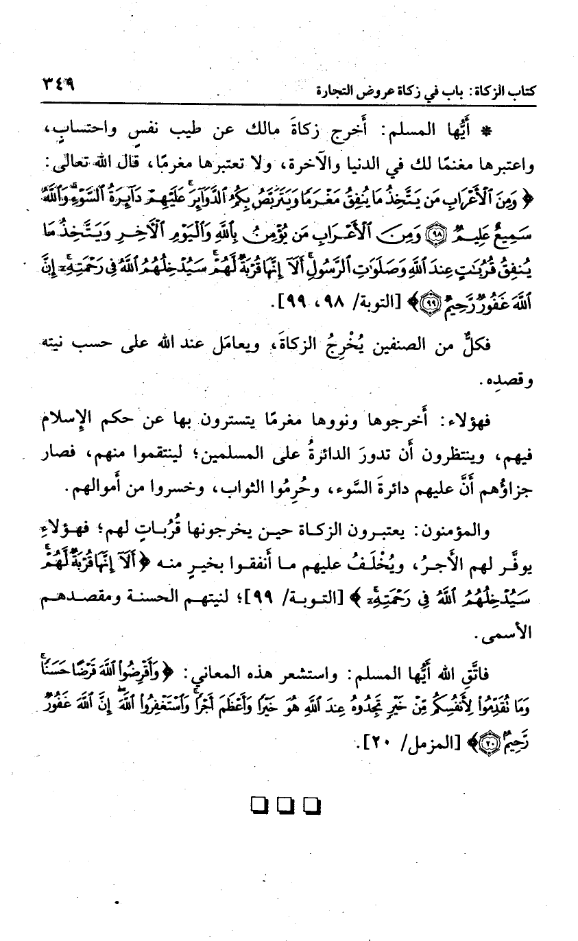 أيها المسلم، أخرج زكاة مالك عن طيب نفس واحتساب، واعتبرها مغنما لك في الدنيا والآخرة، ولا تعتبرها مغرما، قال الله تعالى: {وَمِنَ الْأَعْرَابِ مَنْ يَتَّخِذُ مَا يُنْفِقُ مَغْرَماً وَيَتَرَبَّصُ بِكُمُ الدَّوَائِرَ عَلَيْهِمْ دَائِرَةُ السَّوْءِ وَاللَّهُ سَمِيعٌ عَلِيمٌ وَمِنَ الْأَعْرَابِ مَنْ يُؤْمِنُ بِاللَّهِ وَالْيَوْمِ الْآخِرِ وَيَتَّخِذُ مَا يُنْفِقُ قُرُبَاتٍ عِنْدَ اللَّهِ وَصَلَوَاتِ الرَّسُولِ أَلا إِنَّهَا قُرْبَةٌ لَهُمْ سَيُدْخِلُهُمُ اللَّهُ فِي رَحْمَتِهِ إِنَّ اللَّهَ غَفُورٌ رَحِيمٌ} ؛ فكل من الصنفين يخرج الزكاة؛ ويعامل عند الله على حساب نيته وقصده؛ فهؤلاء أخرجوها ونووها مغرما يتسترون بها عن حكم الإسلام فيهم، وينتظرون أن تدور الدائرة على المسلمين؛ لينتقموا منهم، فصار جزاءهم أن عليهم دائرة السوء، وحرموا الثواب وخسروا من أموالهم، والمؤمنون يعتبرون الزكاة حين يخرجونها قربات لهم؛ فهؤلاء يوفر لهم الأجر، ويخلف عليهم ما أنفقوا بخير منه، {أَلا إِنَّهَا قُرْبَةٌ لَهُمْ سَيُدْخِلُهُمُ اللَّهُ فِي رَحْمَتِهِ} ؛ لنيتهم الحسنة ومقصدهم الأسمى.