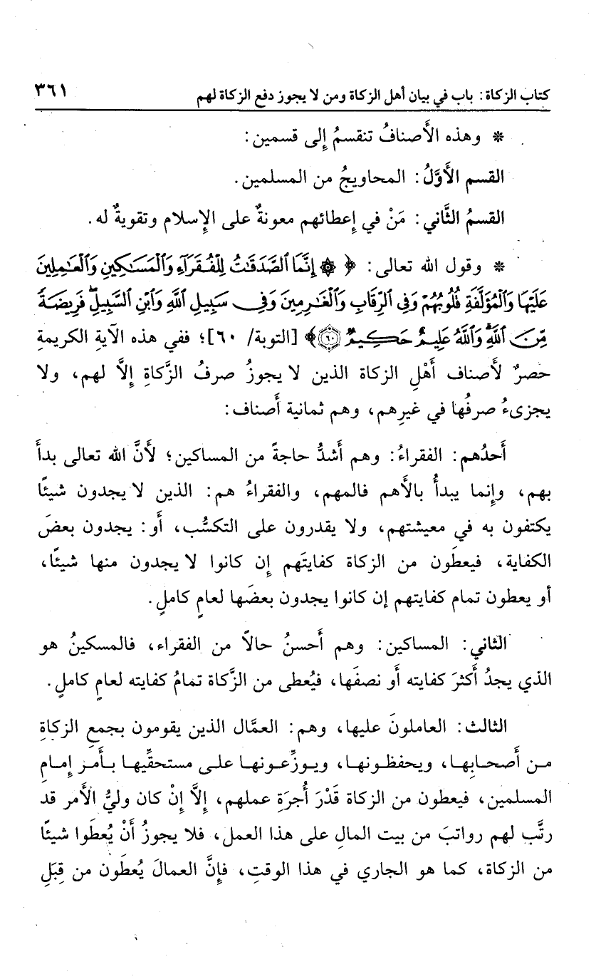 وقول الله تعالى: {إِنَّمَا الصَّدَقَاتُ لِلْفُقَرَاءِ وَالْمَسَاكِينِ وَالْعَامِلِينَ عَلَيْهَا وَالْمُؤَلَّفَةِ قُلُوبُهُمْ وَفِي الرِّقَابِ وَالْغَارِمِينَ وَفِي سَبِيلِ اللَّهِ وَابْنِ السَّبِيلِ فَرِيضَةً مِنَ اللَّهِ وَاللَّهُ عَلِيمٌ حَكِيمٌ} ؛ ففي هذه الآية الكريمة حصر لأصناف أهل الزكاة الذين يجوز صرف الزكاة إلا لهم، ولا يجزئ صرفها في غيرهم. وهم ثمانيه أصناف: