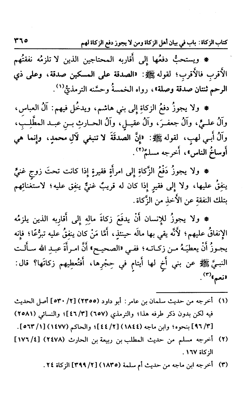 ولا يجوز دفع الزكاة إلى بني هاشم، ويدخل فيهم: آل العباس، وآل علي، وآل جعفر، وآل عقيل، وآل الحارث بن عبد المطلب، وآل أبي لهب؛ لقوله صلى الله عليه وسلم: "إن الصدقة لا تنبغي لآل محمد، وإنما هي أوساخ الناس"، أخرجه مسلم.
