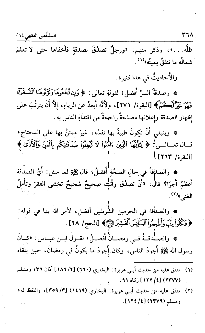 ظله ... "، وذكر منهم: "ورجلاً تصدق بصدقة فأخفاها حتى لا نعلم شماله ما تنفق يمينه". والأحاديث في هذا كثيرة. وصدقة السر أفضل؛ لقوله تعالى: {وَإِنْ تُخْفُوهَا وَتُؤْتُوهَا الْفُقَرَاءَ فَهُوَ خَيْرٌ لَكُمْ} ، ولأنه أبعد عن الرياء؛ إلا أن يترتب على إظهار الصدقة وإعلانها مصلحة راجحة من إقتداء الناس به.