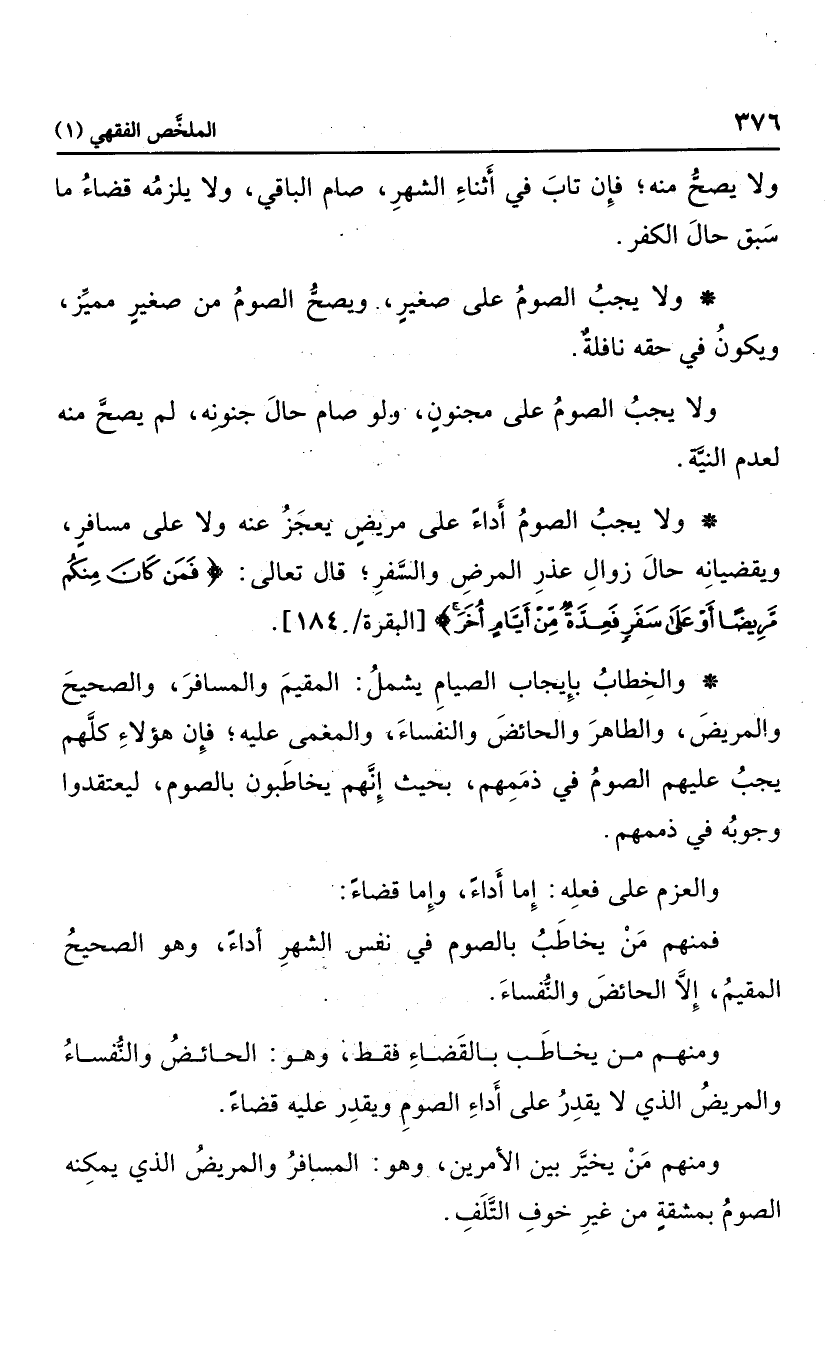 والخطاب بإيجاب الصيام يشمل المقيم والمسافر، والصحيح والمريض، والطاهر والحائض والنفساء، والمغمى عليه؛ فإن هؤلاء كلهم يجب عليهم الصوم في ذممهم؛ بحيث إنهم يخاطبون بالصوم؛ ليعتقدوا وجوبه في ذممهم، والعزم على فعله: إما أداء، وإما قضاء؛ فمنهم من يخاطب بالصوم في نفس الشهر أداء، وهو الصحيح المقيم؛ إلا الحائض والنفساء، ومنهم من يخاطب بالقضاء فقط، وهو الحائض والنفساء والمريض الذي على أداء الصوم ويقدر عليه قضاء، ومنهم من يخبر بين الأمرين، وهو المسافر والمريض الذي يمكنه الصوم بمشقة من غير خوف التلف.