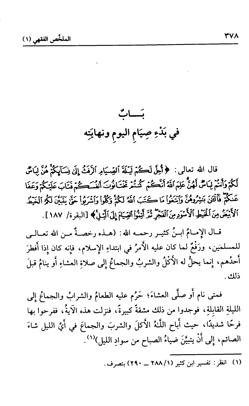 قال الله تعالى: {أُحِلَّ لَكُمْ لَيْلَةَ الصِّيَامِ الرَّفَثُ إِلَى نِسَائِكُمْ هُنَّ لِبَاسٌ لَكُمْ وَأَنْتُمْ لِبَاسٌ لَهُنَّ عَلِمَ اللَّهُ أَنَّكُمْ كُنْتُمْ تَخْتَانُونَ أَنْفُسَكُمْ فَتَابَ عَلَيْكُمْ وَعَفَا عَنْكُمْ فَالْآنَ بَاشِرُوهُنَّ وَابْتَغُوا مَا كَتَبَ اللَّهُ لَكُمْ وَكُلُوا وَاشْرَبُوا حَتَّى يَتَبَيَّنَ لَكُمُ الْخَيْطُ الْأَبْيَضُ مِنَ الْخَيْطِ الْأَسْوَدِ مِنَ الْفَجْرِ ثُمَّ أَتِمُّوا الصِّيَامَ إِلَى اللَّيْلِ} .