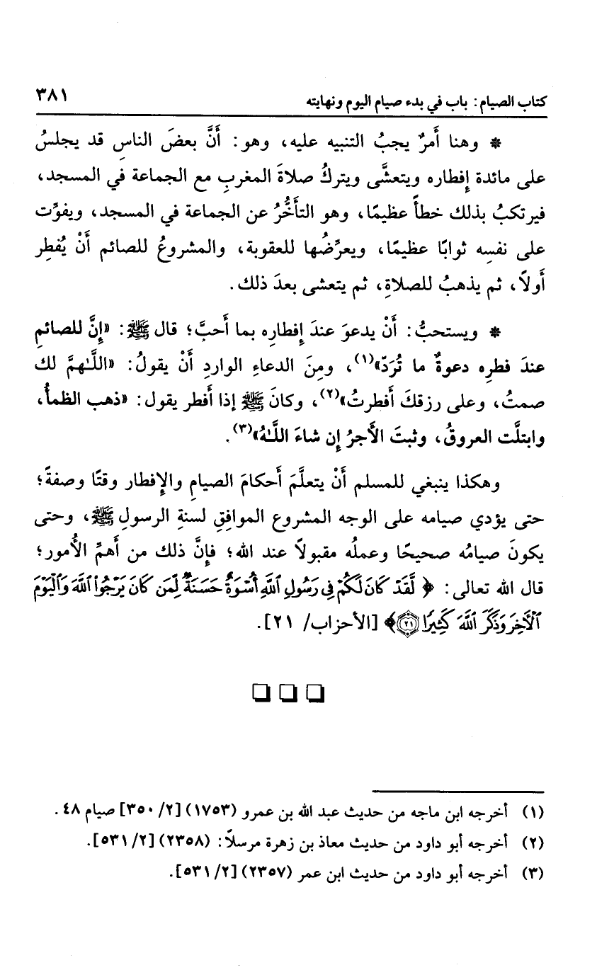 وهكذا ينبغي للمسلم أن يتعلم أحكام الصيام والإفطار وقتا وصفة حتى يؤدي صيامه على الوجه المشروع الموافق لسنة الرسول صلى الله عليه وسلم، وحتى يكون صيامه صحيحا وعمله مقبولاً عند الله؛ فإن ذلك من أهم الأمور، قال الله تعالى: {لَقَدْ كَانَ لَكُمْ فِي رَسُولِ اللَّهِ أُسْوَةٌ حَسَنَةٌ لِمَنْ كَانَ يَرْجُو اللَّهَ وَالْيَوْمَ الْآخِرَ وَذَكَرَ اللَّهَ كَثِيراً} .