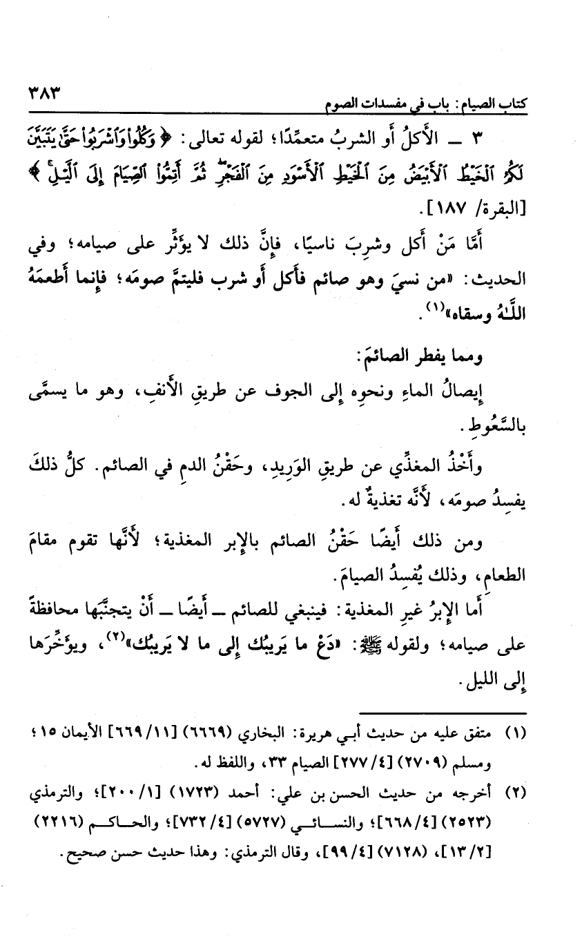 3 الأكل أو الشرب متعمدًا؛ لقوله تعالى: {وَكُلُوا وَاشْرَبُوا حَتَّى يَتَبَيَّنَ لَكُمُ الْخَيْطُ الأَبْيَضُ مِنَ الْخَيْطِ الأَسْوَدِ مِنَ الْفَجْرِ ثُمَّ أَتِمُّوا الصِّيَامَ إِلَى اللَّيْلِ} .