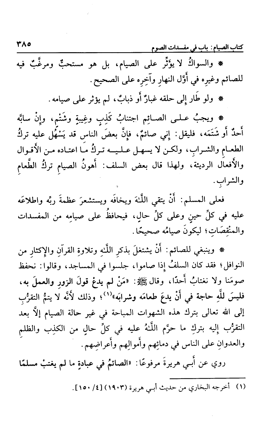 وينبغي للصائم أن يشتغل بذكر الله وتلاوة القرآن والإكثار من النوافل، فقد كان السلف إذا صاموا؛ جلسوا في المساجد، وقالوا: نحفظ صومنا ولا نغتاب أحدًا، وقال صلى الله عليه وسلم: "من لم يدع قول الزور والعمل به؛ فليس لله حاجة في أن يدع طعامه وشرابه"، وذلك لأنه يتم التقرب إلى الله تعالى بترك هذه الشهوات المباحة في غير حالة الصيام إلا بعد التقرب إليه بترك ما حرم الله عليه في كل حال من الكذب والظلم والعدوان على الناس في دمائهم وأموالهم وأعراضهم، روي عن أبي هريرة مرفوعا: "الصائم في عبادة ما لم يغتب مسلما